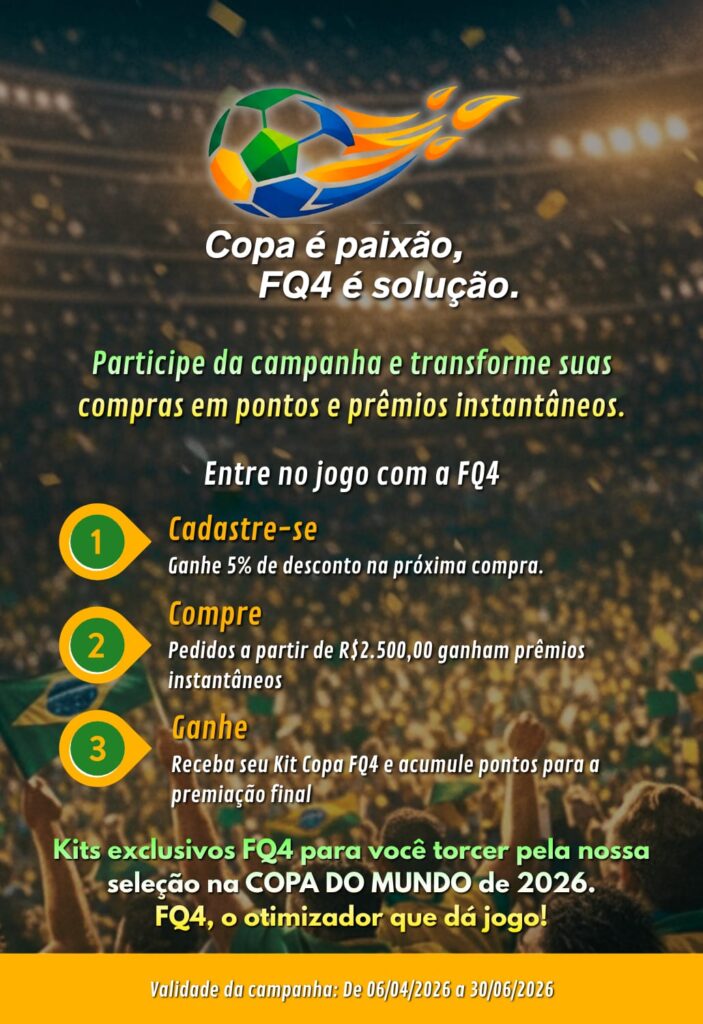 A FQ4 Indústria Química, empresa líder no desenvolvimento e fornecimento de soluções químicas inovadoras, apresenta a campanha de incentivo “Copa é paixão, FQ4 é solução”. Esta iniciativa foi elaborada com o objetivo de reconhecer e recompensar o empenho e a dedicação de parceiros e clientes, fortalecendo o relacionamento comercial e incentivando o crescimento conjunto.